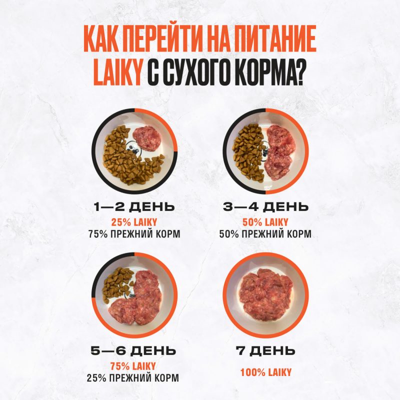 - ВАШ ПИТОМЕЦ ХОЧЕТ СЫРОГО МЯСА! Животные, перешедшие на рацион LAIKY, больше не хотят питаться промышленными кормами. Их организм откликается на натуральное видотипичное питание отличным пищеварением и оптимальным метаболизмом. Вы сами заметите положительные изменения: сияющие глаза, радостную активность, энергию жизни — признаки счастливого и здорового питомца.
